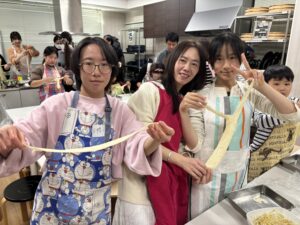 十分にこねて寝かした生地は伸びる伸びる~。この伸ばす作業が楽しい部分で、みんなで人数分足りるようたくさん伸ばして、お鍋に野菜と一緒に投入します。もうすぐ完成が見えてきました✨