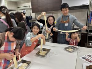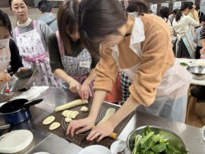 十分にこねて寝かした生地は伸びる伸びる~。この伸ばす作業が楽しい部分で、みんなで人数分足りるようたくさん伸ばして、お鍋に野菜と一緒に投入します。もうすぐ完成が見えてきました✨