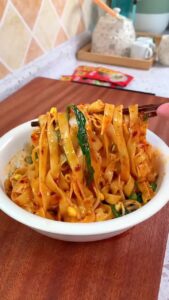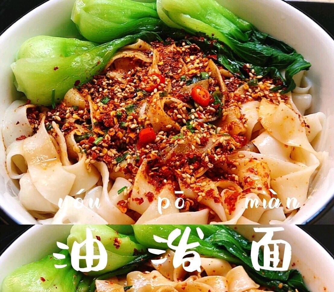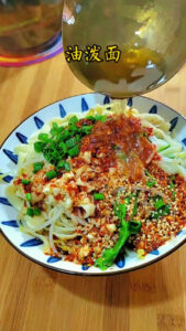油泼面(yóu pō miàn)は中国の陝西省(せんせいしょう)を代表する麺料理で、「油そば」や「西安風ペペロンチーノ」などと例えられます。作り方は、生地から練り上げて茹でた幅広の熱々麺に、唐辛子の粉、ニンニクなどの薬味を乗せ、熱した油をジュワーとかけて作ります。薬味と熱した油の香ばしい香りが食欲をそそり、ピリ辛でジャンキーな味わいがクセになります。
